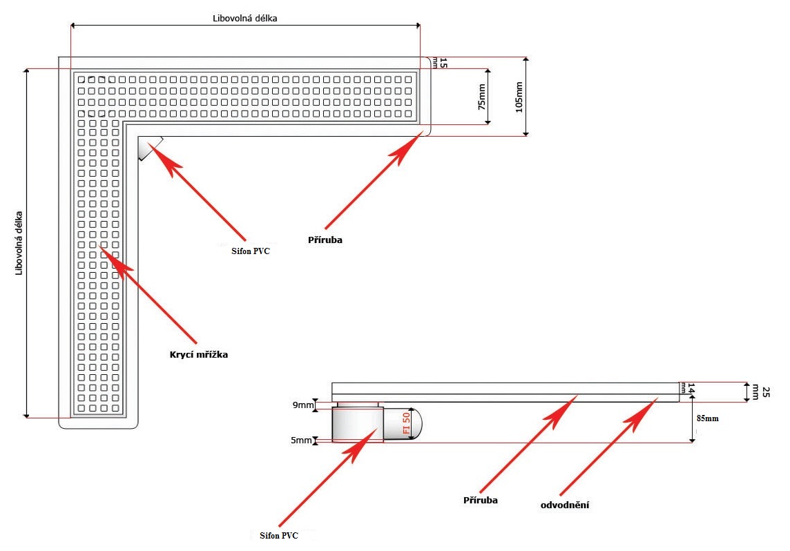 - Sprchový odtokový žlab rohový L s přírubou (plastový sifon)